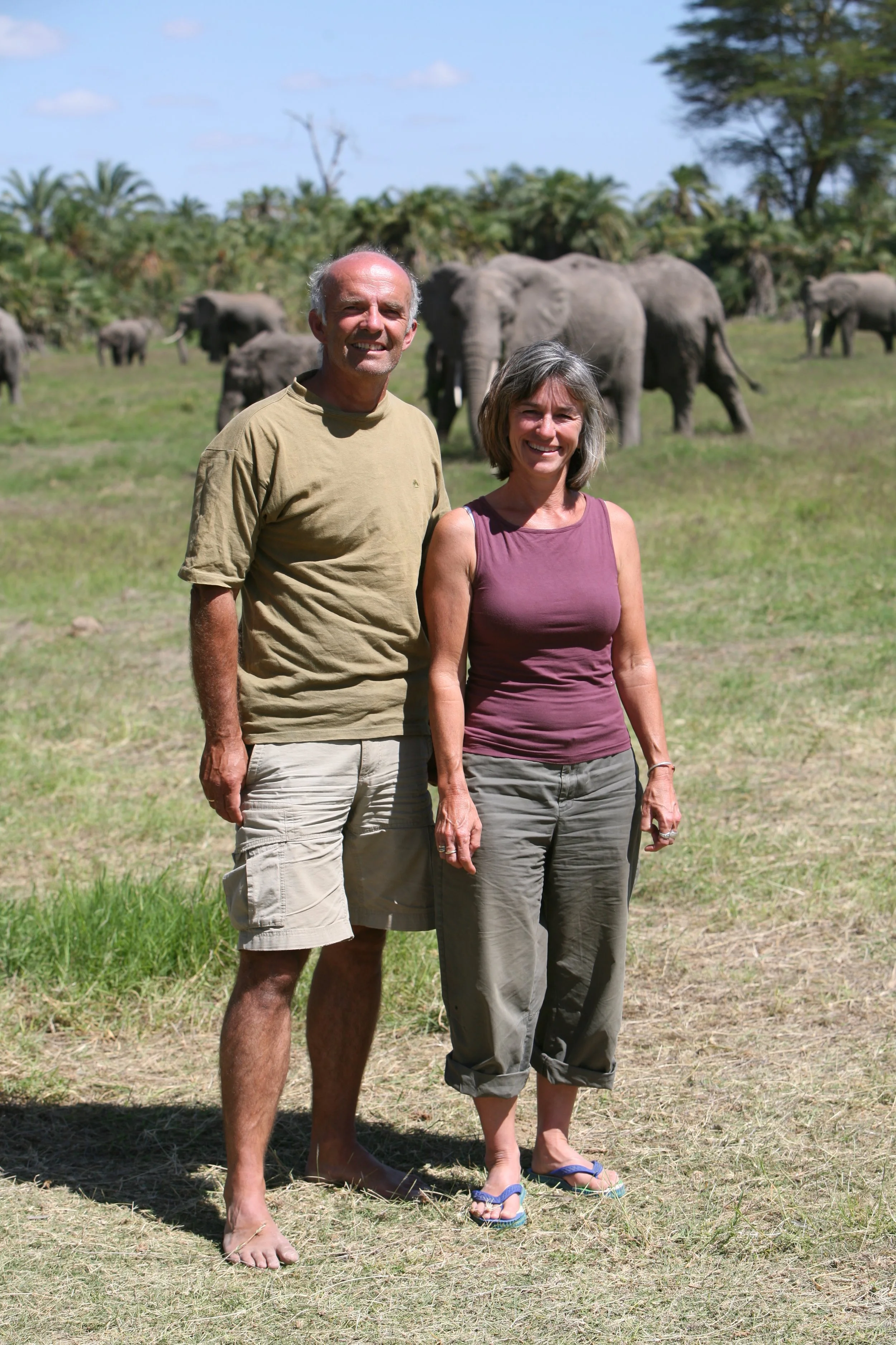 Joyce Poole og Petter Granli ved forskningscamp i Amboseli National Park i Kenya.