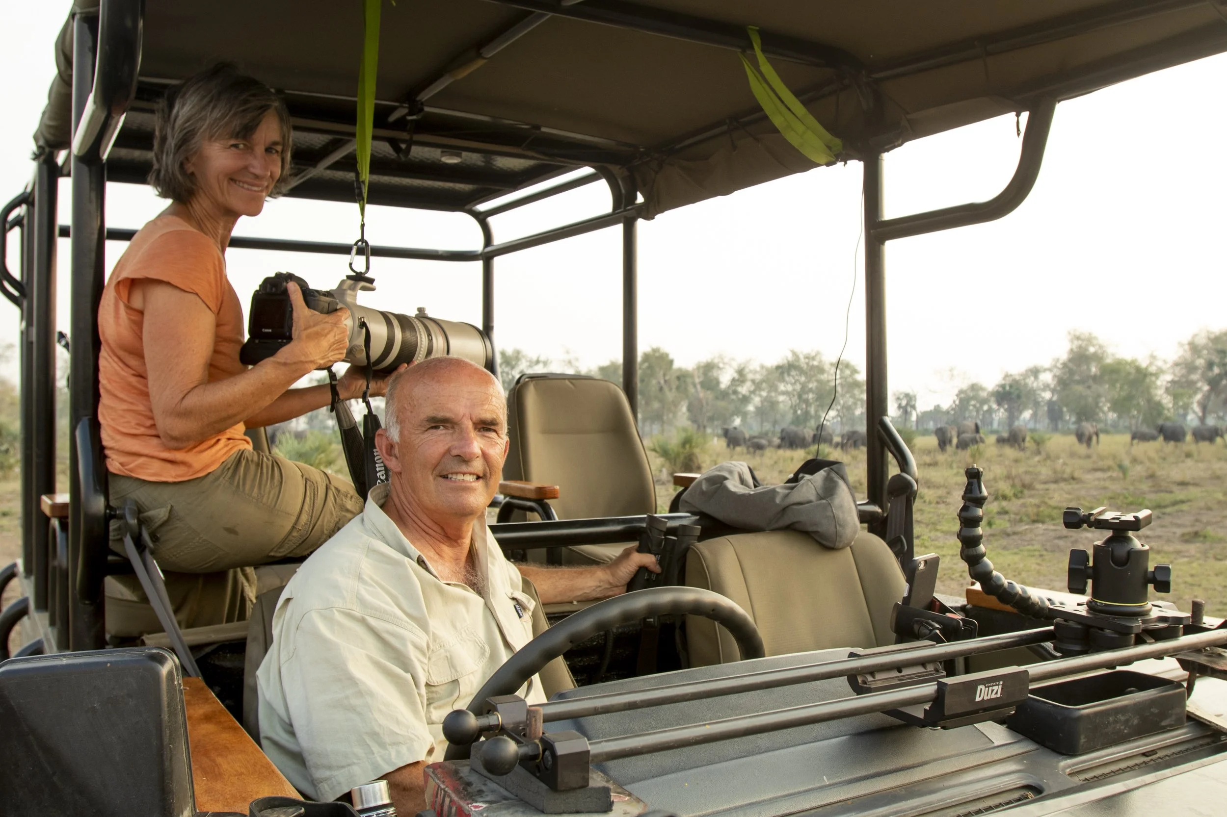 Joyce Poole og Petter Granli i arbeid med elefantprosjekt i Gorongosa National Park i Mozambique.