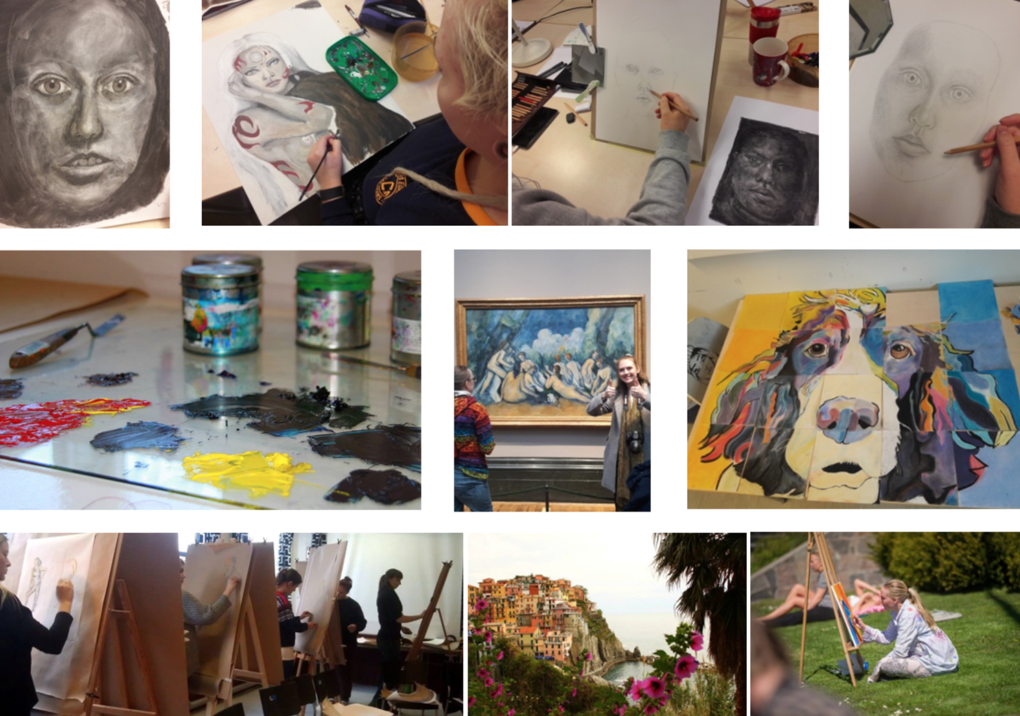 12.00 - MEIERIGÅRDEN - Tegne, male, reiselinja er innom ulike teknikker i løpet av skoleåret. Grunnleggende skyggelegging med kull og blyant, kritt og penn. En periode tegner vi kropp, kroki og portrett. Vi har foto og lærer ulike trykkteknikker, papptrykk, lino og koldnål, og våren skal avsluttes med akvarell og akrylmaleri. I tillegg reiser vi på inspirerende turer...om koronasituasjonen tillater det.